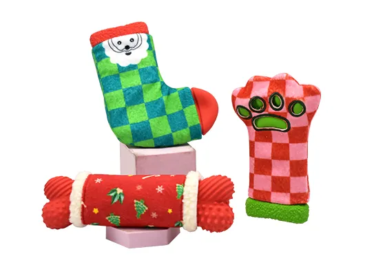 This festive pet toy combines latex and plush with a Christmas theme in sock, bone, and paw designs. The latex sock features a built-in squeaker and treat-hiding dents, while the soft plush sleeve adds cozy holiday charm, making playtime fun, interactive, and seasonally joyful for dogs.
