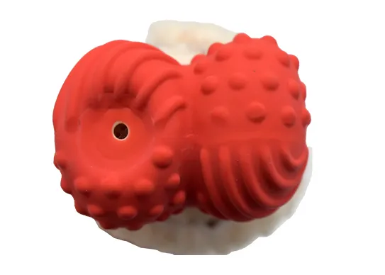 2. Round latex dents on sock sides cleverly store small treats, promoting mental stimulation and rewarding playful chewing for improved dog happiness.