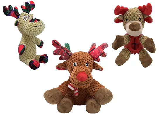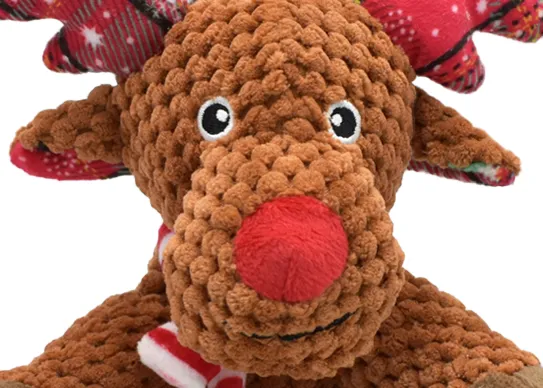 Christmas Plush Dog Toy Series – Melard Color Reindeer Collection. Celebrate the holidays with adorable plush reindeer dog toys made of soft pineapple fleece and festive printed fabric. Each toy includes a built-in BB squeaker for interactive fun. Perfect for gifting and snuggling!