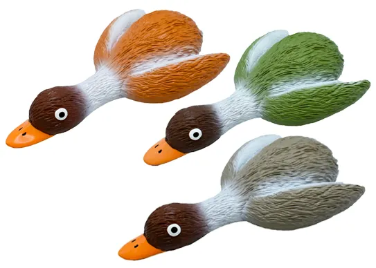 This fun latex dog toy comes in vibrant green, orange, or gray, with white spray-painted wings, neck, and belly. Designed to engage your pup, it features a built-in squeaker located in the tail that mimics a duck call, delivering endless entertainment and interactive play for your furry friend.